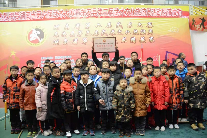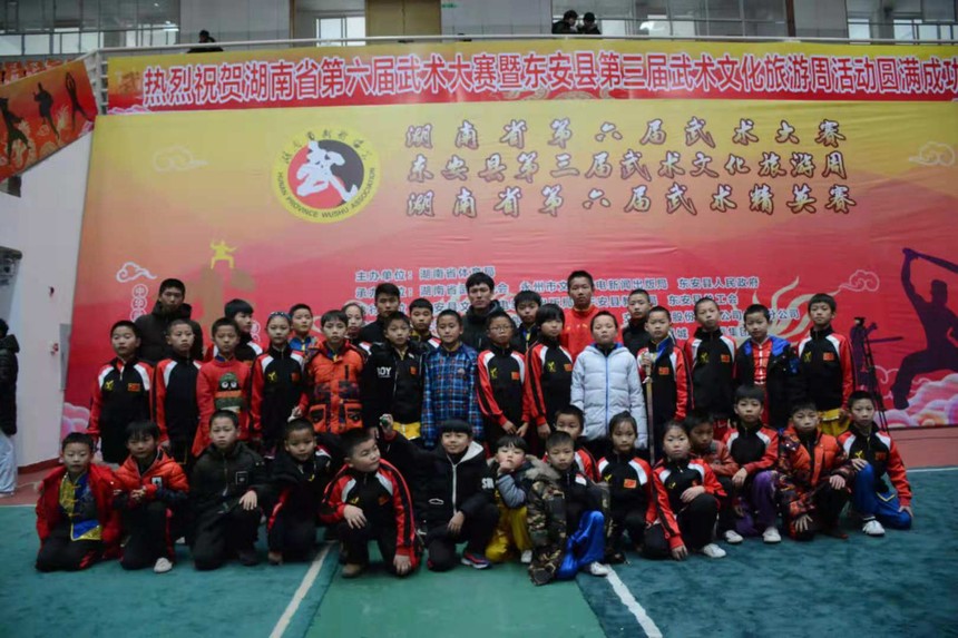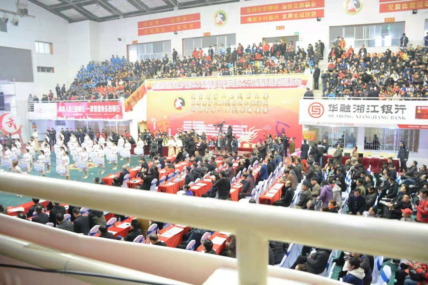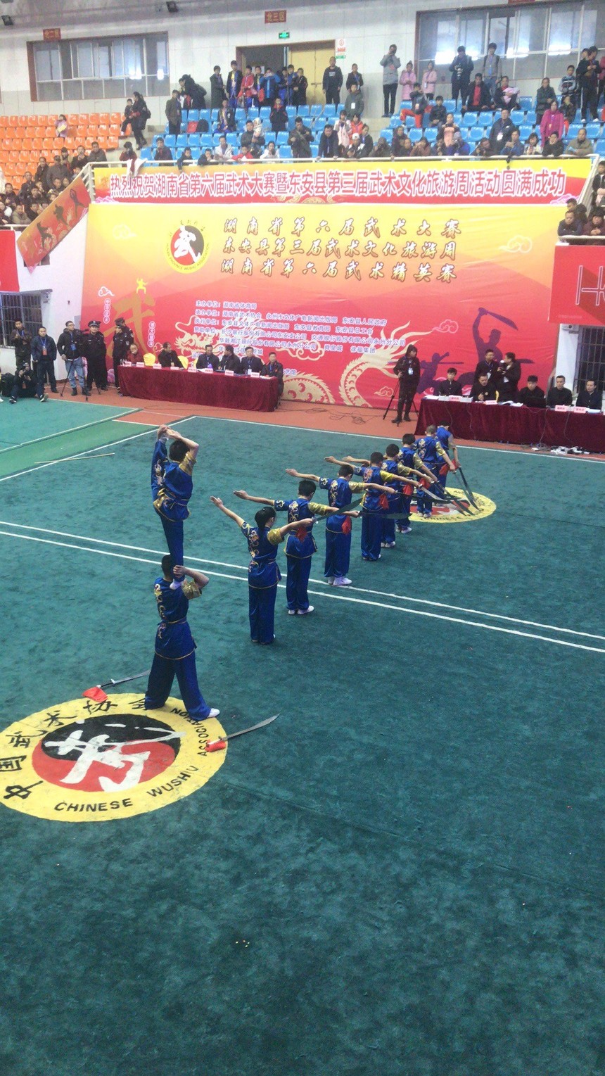 12月8日湖南省第六届武术精英大赛在东安县一中体艺馆隆重开幕。来自湖南省14个市州75个代表队的1200名运动员参加角逐。湖南省政协原副主席、省文联主席欧阳斌宣布湖南省第六届武术大赛开幕,并与众多嘉宾一道启动开幕式按钮。
